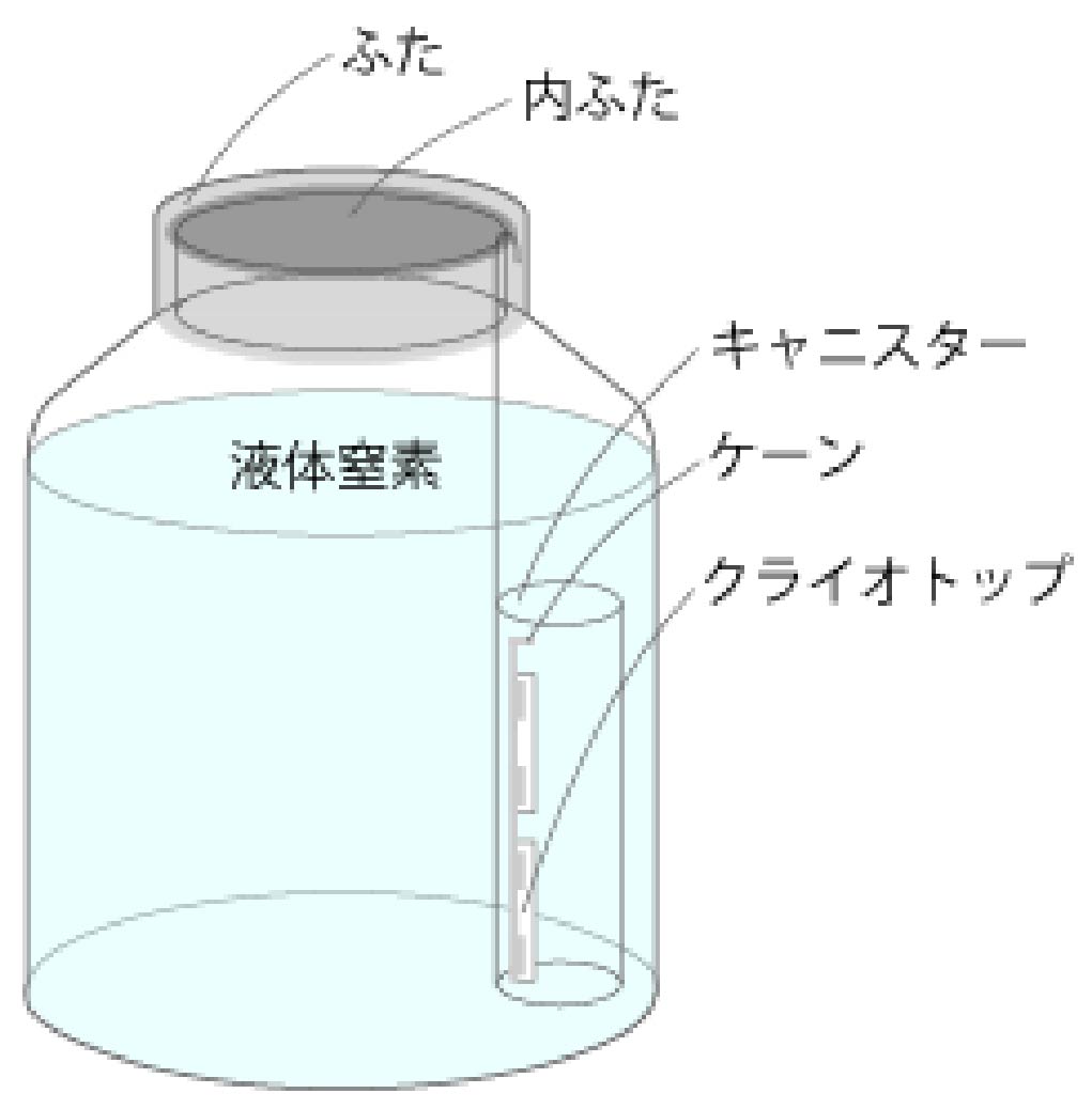 凍結デバイスを「ケーン」という金属の器具に固定し、ケーンごと「キャニスター」に入れて液体窒素タンクに収納します。
