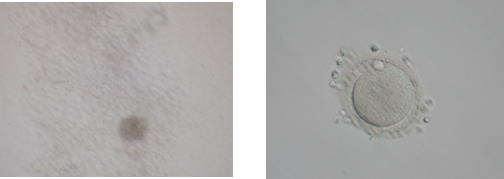採卵されたばかりの卵子は、顆粒膜細胞(卵丘細胞)におおわれています(写真左下)。
