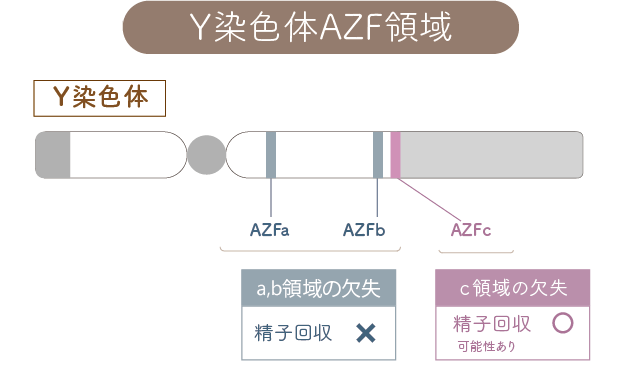 Y染色体には、精子をつくるために重要な AZF領域(a/b/c) があります。この部分にごく小さな欠失(遺伝子の欠け)があると、極端に精子がつくられにくくなる 場合があります。